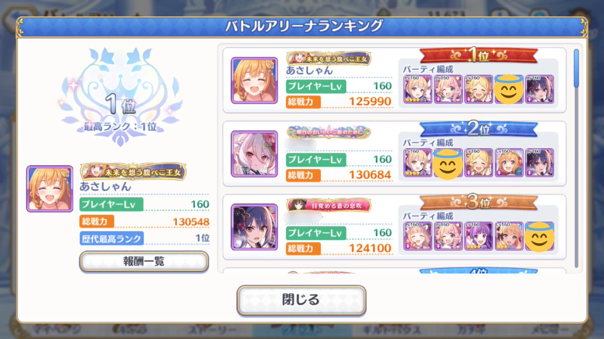 あさしゃん 初めてアリーナ1位で終わった やたら流行ってる編成が一周回ってリノ砲で瞬殺できるの面白い プリコネr